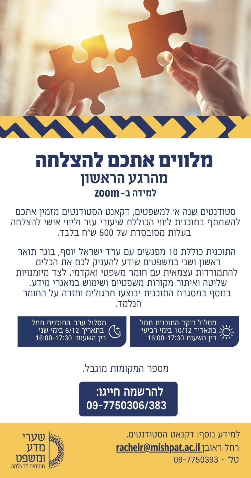סטודנטים שנה א' למשפטים, תוכנית ליווי לסיוע בהתמודדות עם חומר לימודי משפטיים >>
